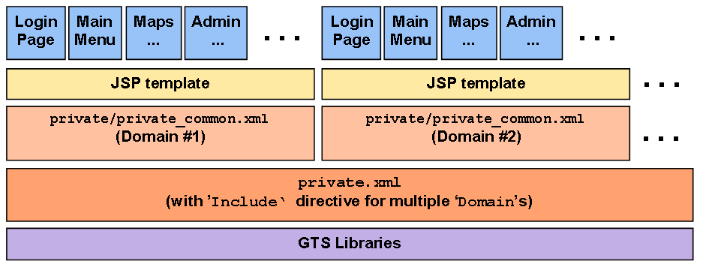 The various JSP templates utilize Java "Tag Libraries" for indicating where the various web pages should display their content. You can see the tag-library usage by searching for the tags "gts:var" and "gts:track in the above JSP files.